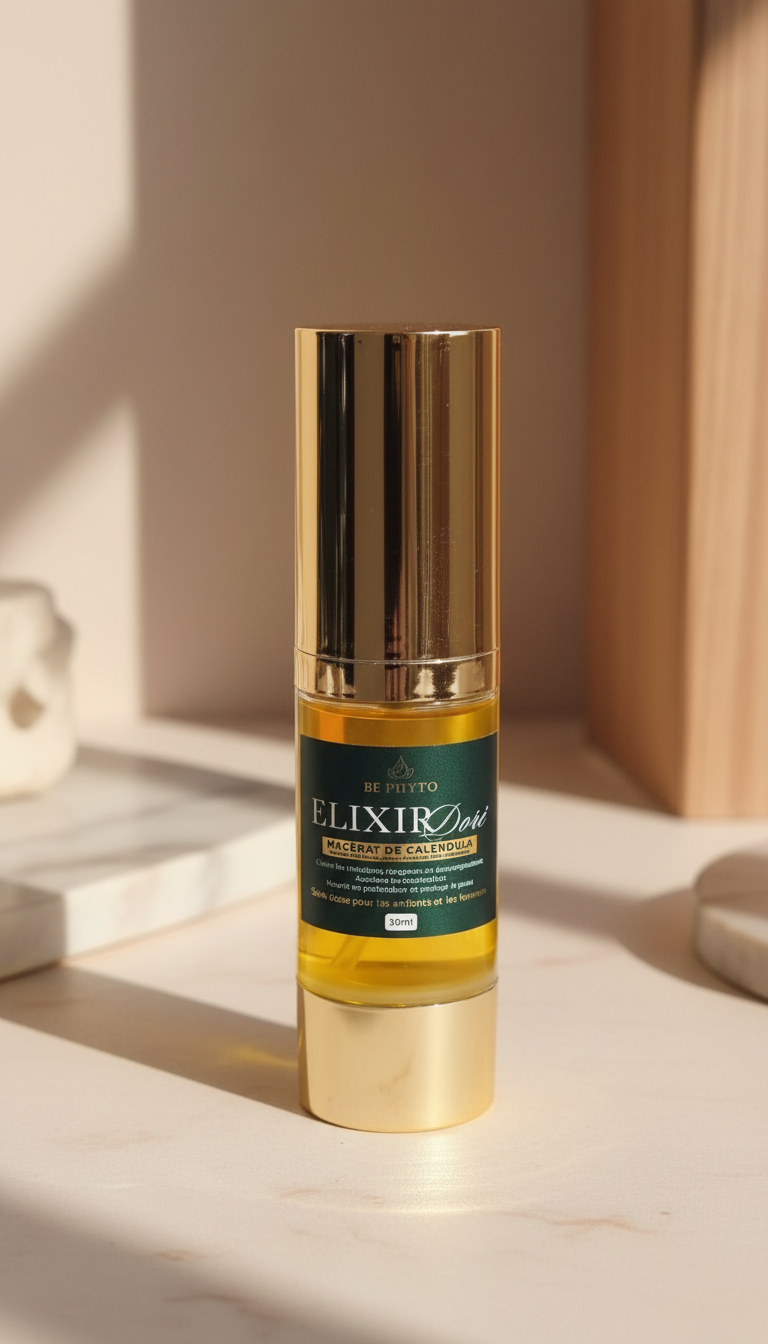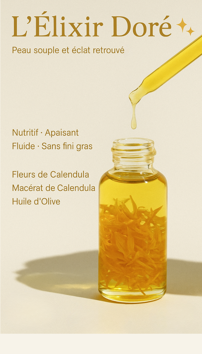 L'Élixir Doré est bien plus qu'une huile de soin : c'est un macérât huileux d'exception, issu du mariage entre les fleurs de calendula soigneusement récoltées et l'huile d'olive extra-vierge du Maroc, reconnue pour sa richesse en antioxydants et sa noblesse.